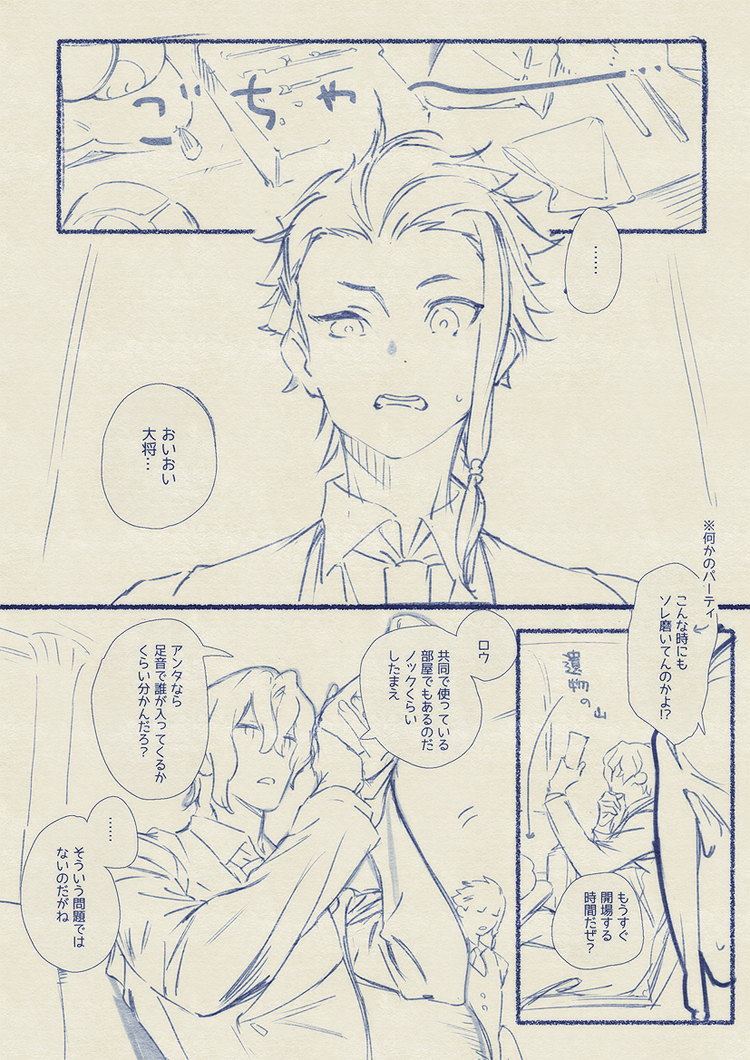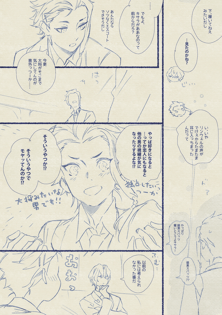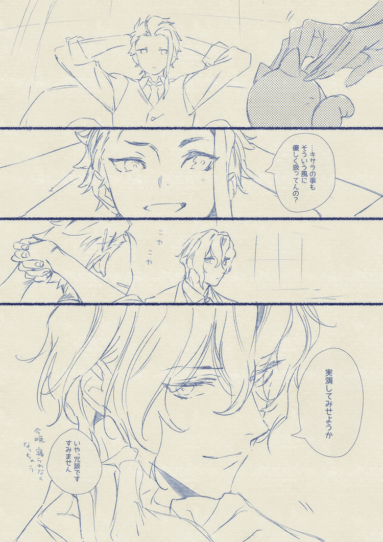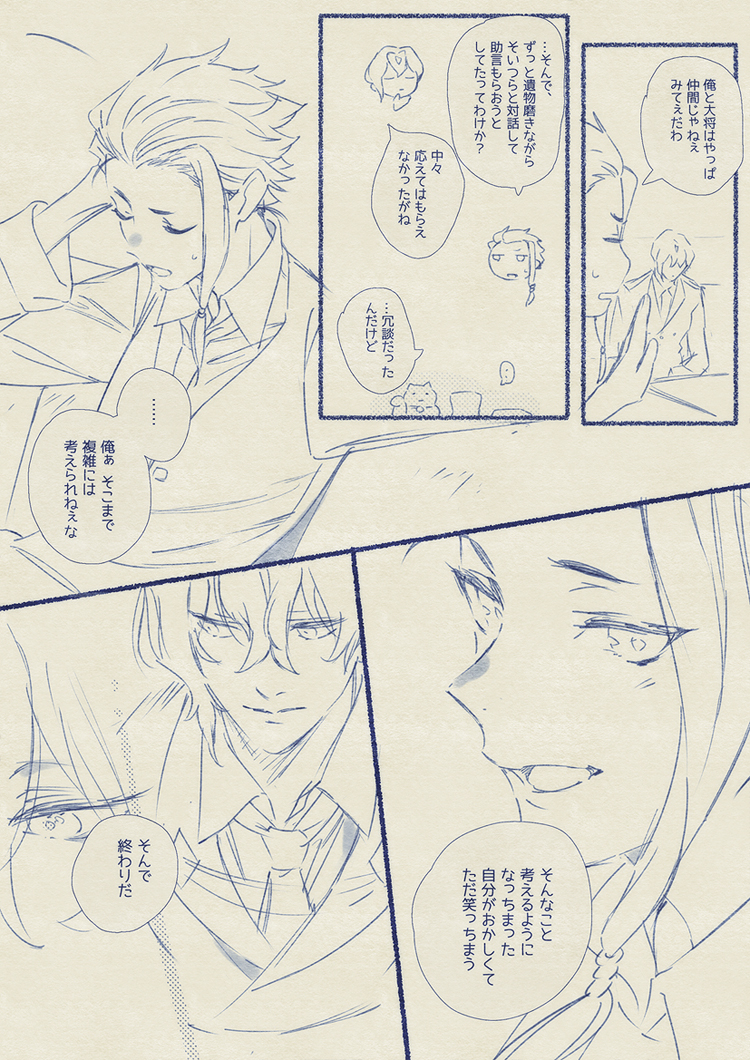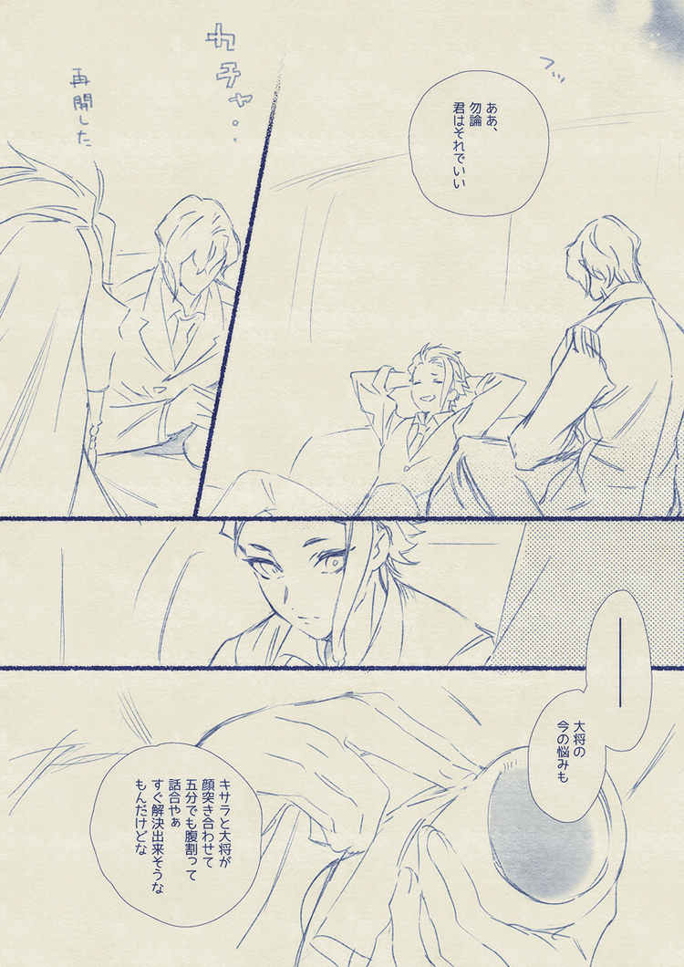 当初、1P目の「おいおい大将」「こんな時にまでソレ磨いてんのかよ」からの最後のページの「そんな風に優しくしてんの」、「実践してみせようか」の4コマ漫画の予定だったのにオチまでの流れ膨らませてたら楽しかったので長々と描いてしまった…✍😂